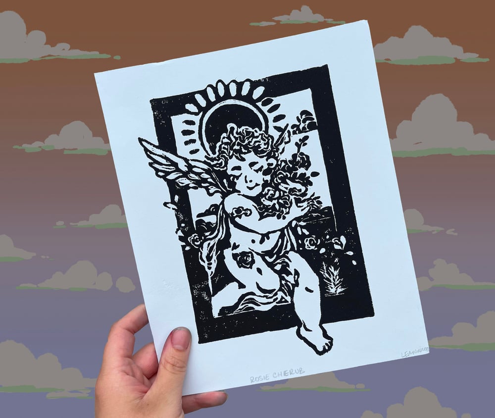 Step into a new season of life with this rosie cherub print! Han-carved and printed, hang this guy up in your time and he is sure to bring you good vibes as you grow and change.