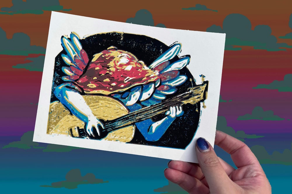 Have you ever seen those videos where people hook their synthesizers up to plants and mushrooms? What’s so crazy about it is the way they chat and sing with eachother via bio waves. This reduction block print is pretty much inspired by just that, the musical magic of the natural world.
