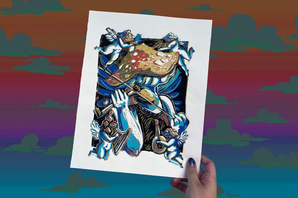 Have you ever seen those videos where people hook their synthesizers up to plants and mushrooms? What’s so crazy about it is the way they chat and sing with eachother via bio waves. This reduction block print is pretty much inspired by just that, the musical magic of the natural world.